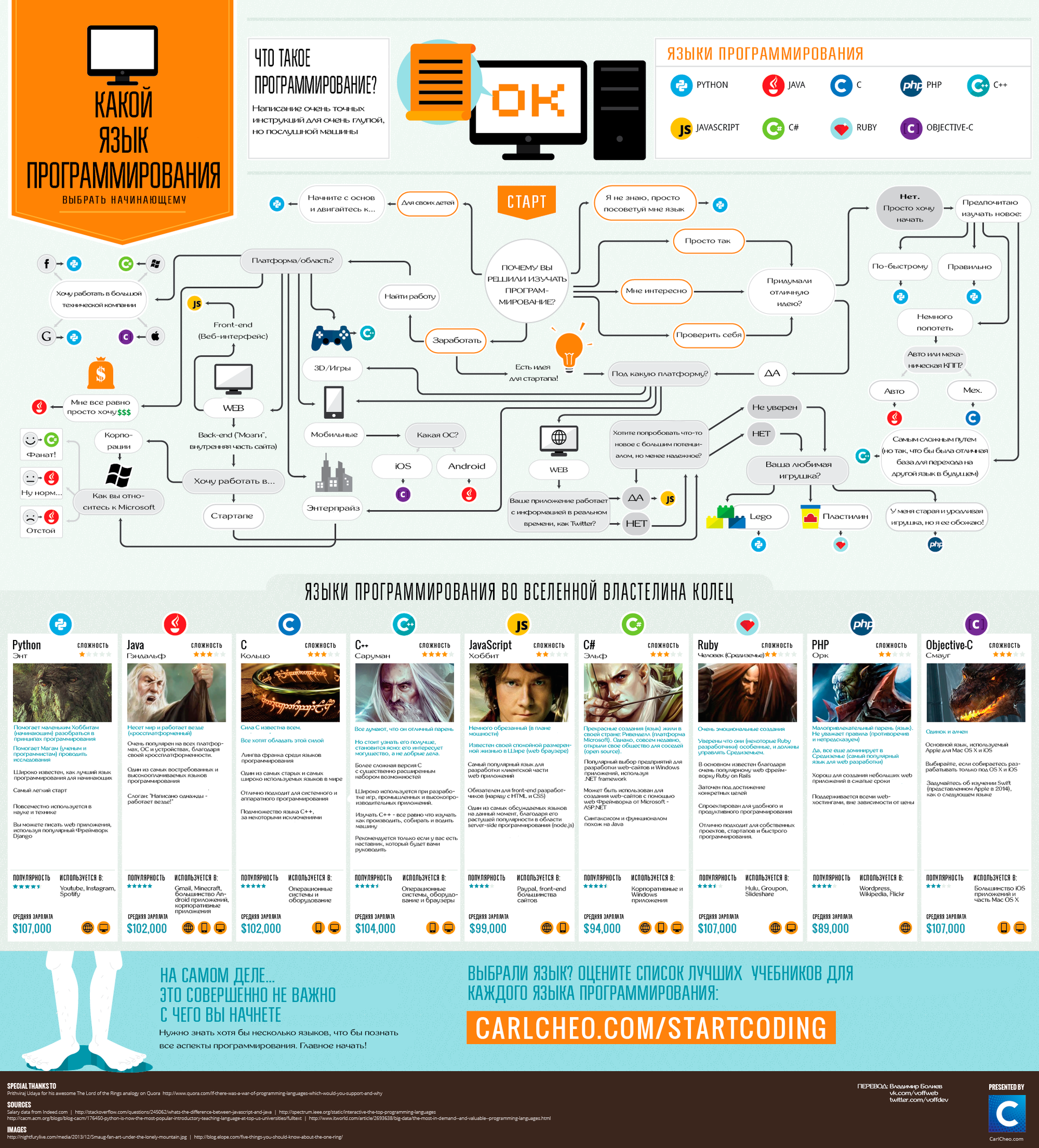 Главные герои инфографики — это самые популярные языки вроде JavaScript, Java, Python, Ruby, С, PHP и другие. Критериями выбора могут служить самые разные факторы, начиная от желания заработать много денег или реализовать свою идею, до любимой игрушки. Изюминка инфографики — сравнение популярных языков программирования с героями саги «Властелин колец».