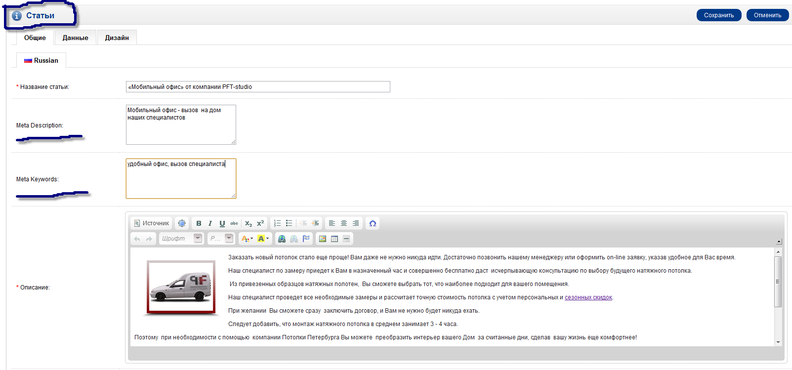 На этом все — в админ панели сайта — появляется возможность писать meta-теги для Ваших статей: пример сайта где к статье добавлены теги