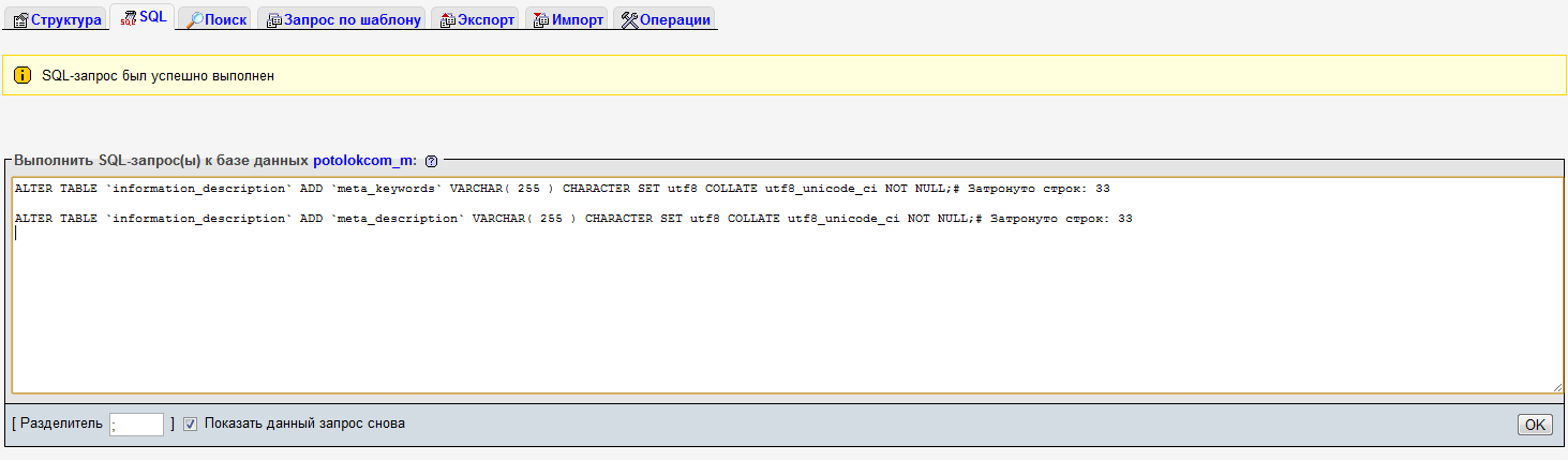 3. Входим в Бд сайта и выполняем SQL-запрос: |