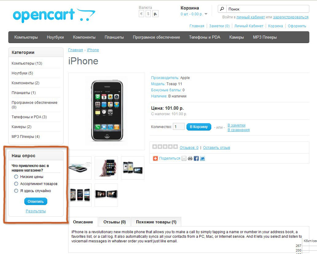 Модуль опросы «Poll Plus» — позволяет добавить блок «Наш опрос». Возможно добавление до 8 ответов на вопрос, ведется статистика по опросу, которую может посмотреть любой клиент магазина.Администратор может создавать любое количество опросов. Теперь и для версии OpenCart 1.5.1.х