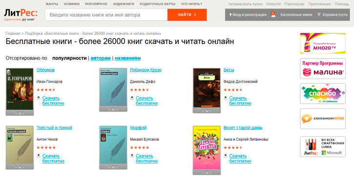 Это магазин электронных книг, однако в нем есть бесплатный раздел, в котором представлено более 26 000 произведений классиков и современников. Горячих новинок и зарубежных бестселлеров в разделе нет, зато есть много книг из разряда must read. Книги можно скачать, однако для этого необходимо авторизироваться на сайте.